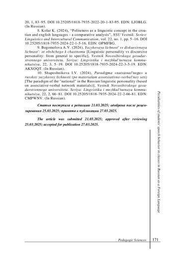 8. Kolar K. (2024), “Politeness as a linguistic concept in the croatian and english languages - a comparative analysis”, NSU Vestnik. Series: Linguistics and Intercultural Communication, vol. 22, no. 1, pp. 5-16. DOI: 10.25205/1818-7935-2024-22-1-5-16 EDN: OPMFBG личность: от общего к частному // Вестник Новосибирского государственного университета. Серия: Лингвистика и межкультурная коммуникация. 2024. Т. 22, № 3. С. 5-19. DOI: 10.25205/1818-7935-2024-22-3-5-19 EDN: AKXOQT