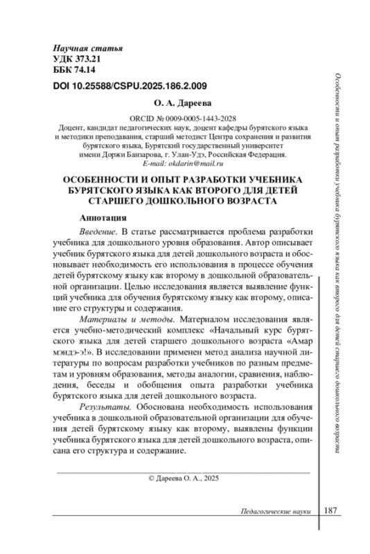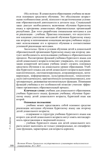 Результаты. Обоснована необходимость использования учебника в дошкольной образовательной организации для обучения детей бурятскому языку как второму, выявлены функции учебника бурятского языка для детей дошкольного возраста, описана его структура и содержание.