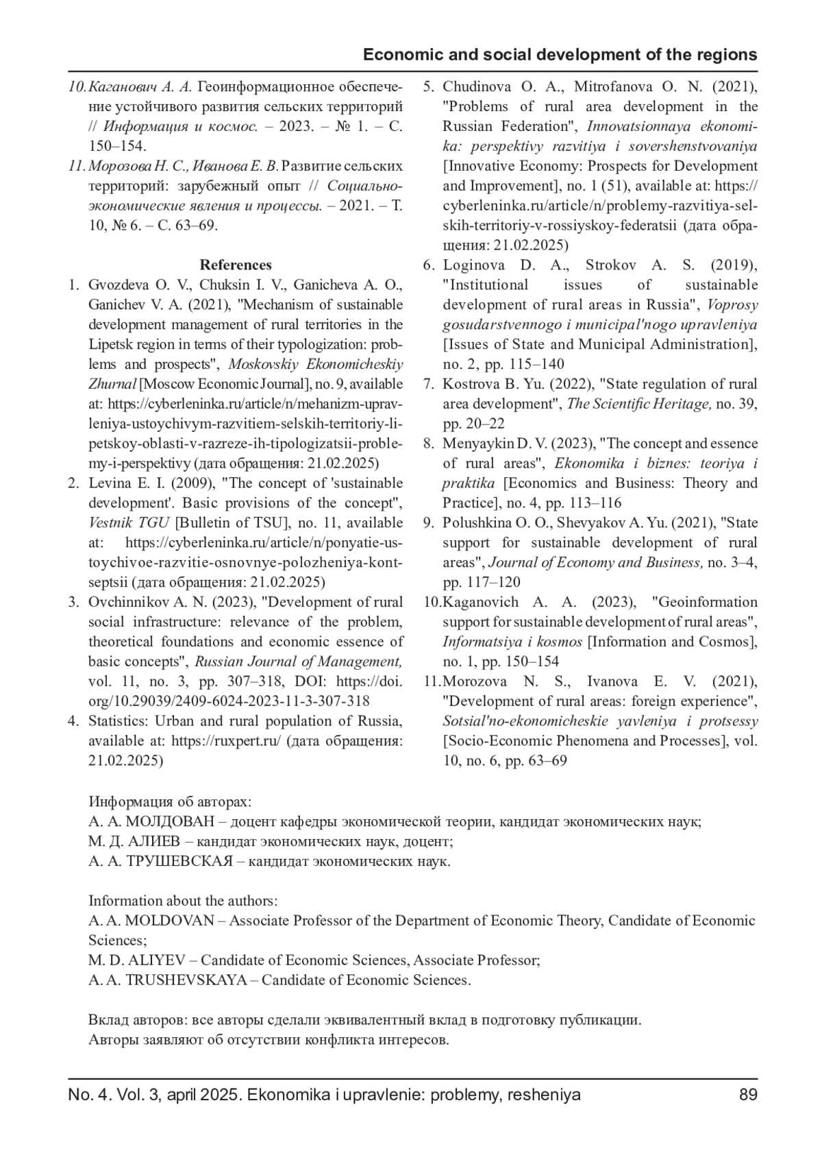 11. Морозова Н. С., Иванова Е. В. Развитие сельских территорий: зарубежный опыт // Социально-экономические явления и процессы. - 2021. - Т. 10, № 6. - С. 63-69.