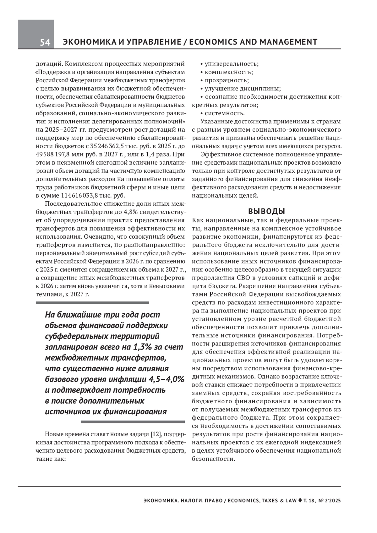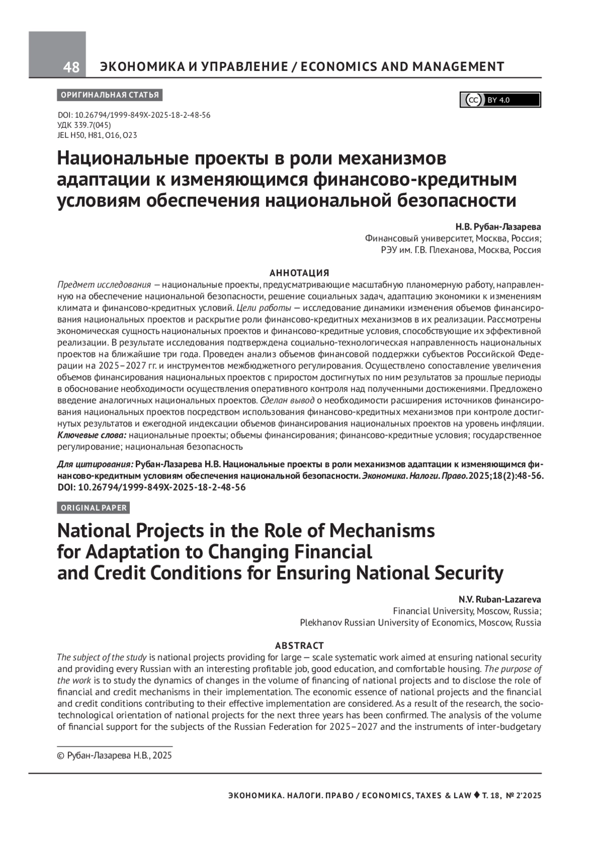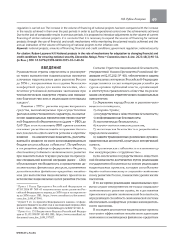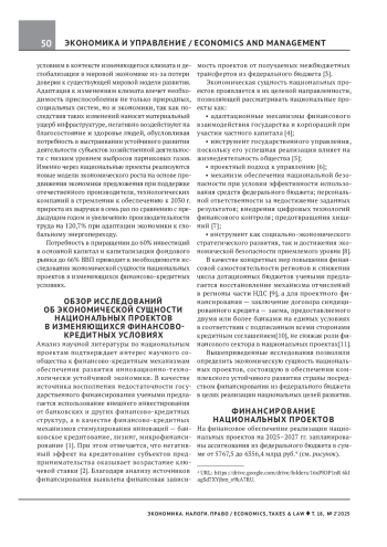 Предмет исследования — национальные проекты, предусматривающие масштабную планомерную работу, направленную на обеспечение национальной безопасности, решение социальных задач, адаптацию экономики к изменениям климата и финансово-кредитных условий. Цели работы — исследование динамики изменения объемов финансирования национальных проектов и раскрытие роли финансово-кредитных механизмов в их реализации. Рассмотрены экономическая сущность национальных проектов и финансово-кредитные условия, способствующие их эффективной реализации. В результате исследования подтверждена социально-технологическая направленность национальных проектов на ближайшие три года. Проведен анализ объемов финансовой поддержки субъектов Российской Федерации на 2025–2027 гг. и инструментов межбюджетного регулирования. Осуществлено сопоставление увеличения объемов финансирования национальных проектов с приростом достигнутых по ним результатов за прошлые периоды в обоснование необходимости осуществления оперативного контроля над полученными достижениями. Предложено введение аналогичных национальных проектов. Сделан вывод о необходимости расширения источников финансирования национальных проектов посредством использования финансово-кредитных механизмов при контроле достигнутых результатов и ежегодной индексации объемов финансирования национальных проектов на уровень инфляции
