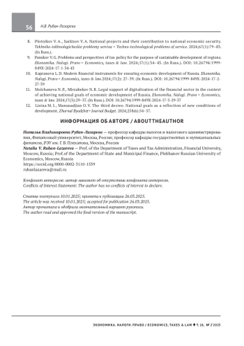 9. Пансков В. Г. Проблемы и перспективы налоговой политики в целях устойчивого развития регионов. Экономика. Налоги. Право. 2024;17(1):34-43. DOI: 10.26794/1999-849X-2024-17-1-34-43 EDN: XHDELS
