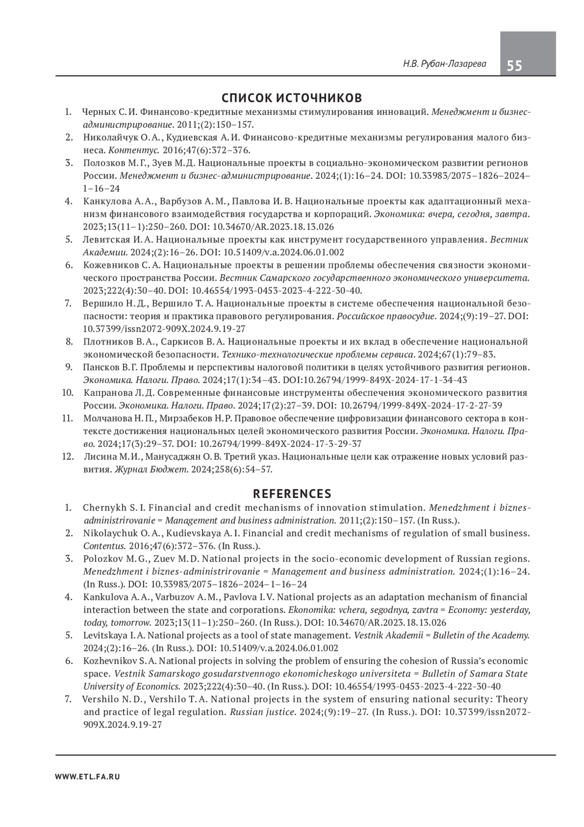 10. Капранова Л. Д. Современные финансовые инструменты обеспечения экономического развития России. Экономика. Налоги. Право. 2024;17(2):27-39. DOI: 10.26794/1999-849X-2024-17-2-27-39 EDN: MEYFNQ