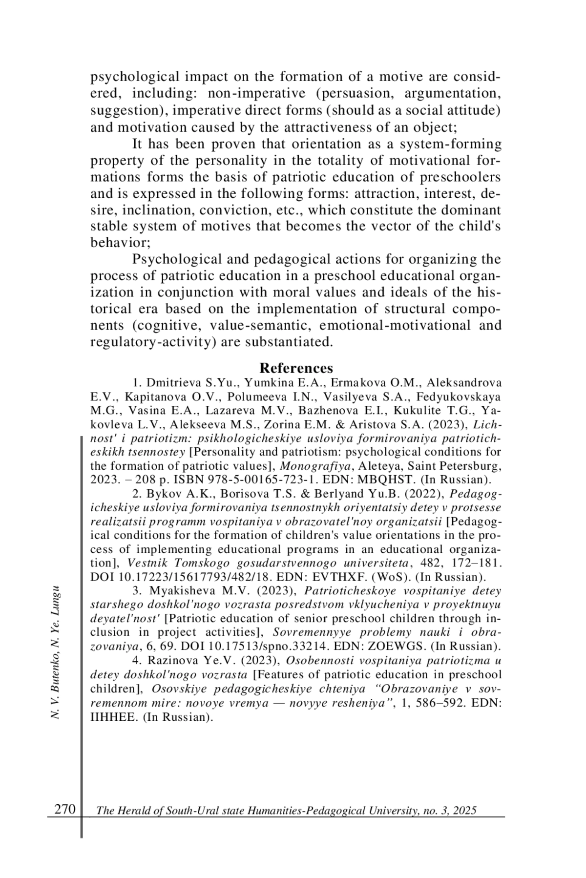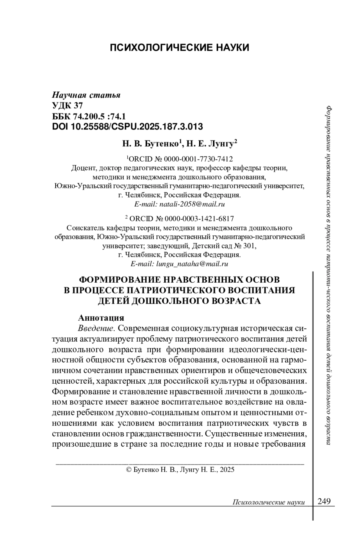 БУТЕНКО Н. В., ЛУНГУ Н. Е. ФОРМИРОВАНИЕ НРАВСТВЕННЫХ ОСНОВ В ПРОЦЕССЕ ПАТРИОТИЧЕСКОГО ВОСПИТАНИЯ ДЕТЕЙ ДОШКОЛЬНОГО ВОЗРАСТА // ВЕСТНИК ЮЖНО-УРАЛЬСКОГО ГОСУДАРСТВЕННОГО ГУМАНИТАРНО-ПЕДАГОГИЧЕСКОГО УНИВЕРСИТЕТА. 2025. № 3 (187)
