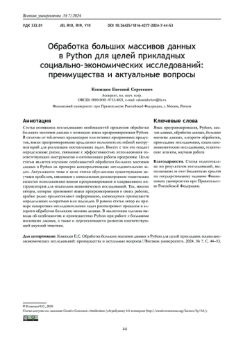 С развитием информационных технологий вопросы, связанные с обработкой и анализом данных, приобретают все большую актуальность, что обусловлено постоянным увеличением доступных массивов данных, а также количества инструментов для работы с ними. Проведение прикладных экономических исследований, призванных решать задачи практического характера, неизбежно оказывается сопряжено с решением соответствующих вопросов, а именно касающихся поиска необходимых данных, инструментов их обработки и комплексного анализа, а также корректного представления результатов [1]. Так, цель статьи состоит в рассмотрении особенностей обработки больших массивов данных с применением инструментария языка программирования Python для социально-экономических работ на примерах непосредственных исследовательских задач. Настоящая статья будет полезна исследователям, которые не являются специалистами в области анализа данных и языках программирования и ищут инструменты, позволяющие эффективно работать с большими объемами данных.