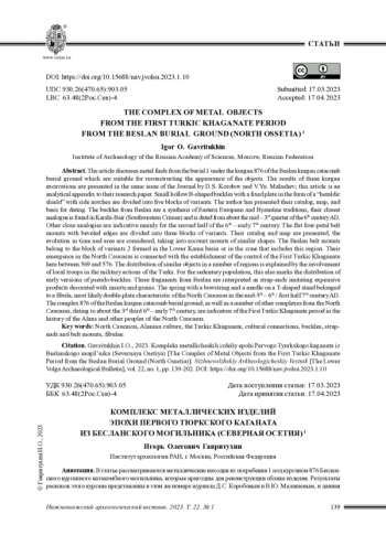 В статье рассматриваются металлические находки из погребения 1 под курганом 876 Бесланского курганного катакомбного могильника, которые пригодны для реконструкции облика изделия. Результаты раскопок этого кургана представлены в этом же номере журнала Д.С. Коробовым и В.Ю. Малашевым, и данная статья является аналитическим приложением к их публикации. Маленькие полые В-образные пряжки с неподвижным щитком в форме «геральдического щита», имеющего боковые вырезы, разделены на пять блоков вариантов. Представлены их каталог, карта, основания для датировки. Пряжки из Бесланского могильника демонстрируют синтез восточноевропейских и византийских традиций, их ближайший аналог найден в Карши-Баире (Юго-Западный Крым) и датируется около середины - третьей четверти VI в., другие близкие аналогии показательны в основном для второй половины VI - начала VII века. Плоские четырехлепестковые накладки со скошенными краями разделены на три блока вариантов. Представлены их каталог и карта, рассмотрена эволюция во времени и пространстве с учетом накладок схожих форм. Накладки из Бесланского могильника относятся к блоку вариантов 2, сложившемуся в бассейне Нижней Камы или зоне, включающей этот регион. Их появление на Северном Кавказе связано с установлением здесь контроля Первого Тюркского каганата между 569 и 576 годами. Распространение схожих вещей в ряде регионов объяснимо привлечением местных отрядов в военные действия тюрок. Для оседлого населения это маркирует и распространение ранних вариантов псевдопряжек. Три фрагмента из Бесланского могильника интерпретированы как ременные наконечники, имитирующие дорогие изделия, украшенные вставками и зернью. Пружина с тетивой и иглой на Т-образной стойке принадлежала фибуле, скорее всего, двупластинчатой, характерной для Северного Кавказа в середине V - VI / первой половине VII века. Комплекс из кургана 876 Бесланского курганного катакомбного могильника, как и ряд других комплексов Северного Кавказа, датированных около третьей трети VI - начала VII в., является показателем эпохи Первого Тюркского каганата в истории алан и других народов Северного Кавказа.
