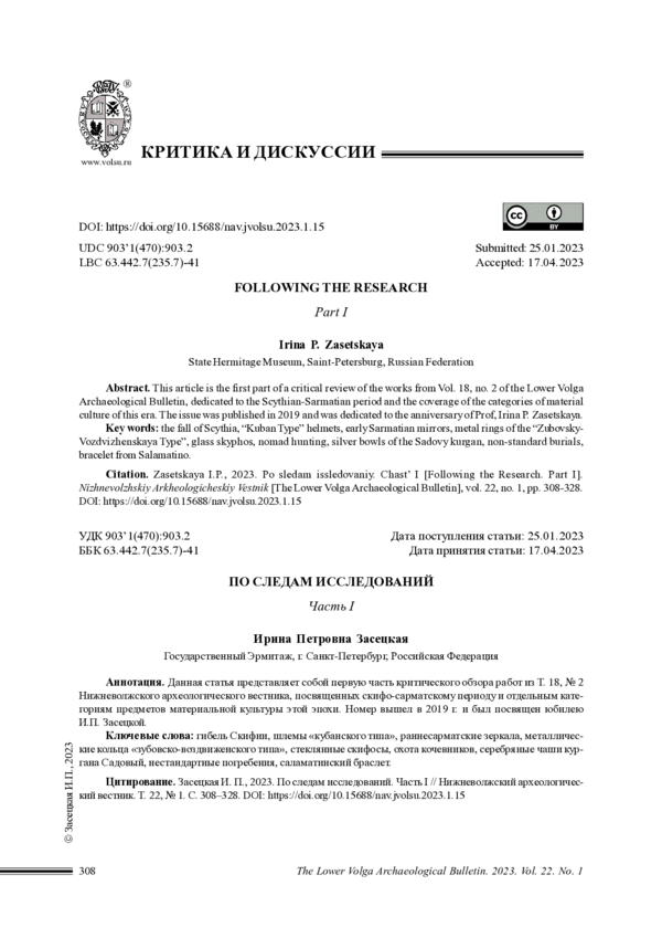 Данная статья представляет собой первую часть критического обзора работ из Т. 18, № 2 Нижневолжского археологического вестника, посвященных скифо-сарматскому периоду и отдельным категориям предметов материальной культуры этой эпохи. Номер вышел в 2019 г. и был посвящен юбилею И.П. Засецкой.
