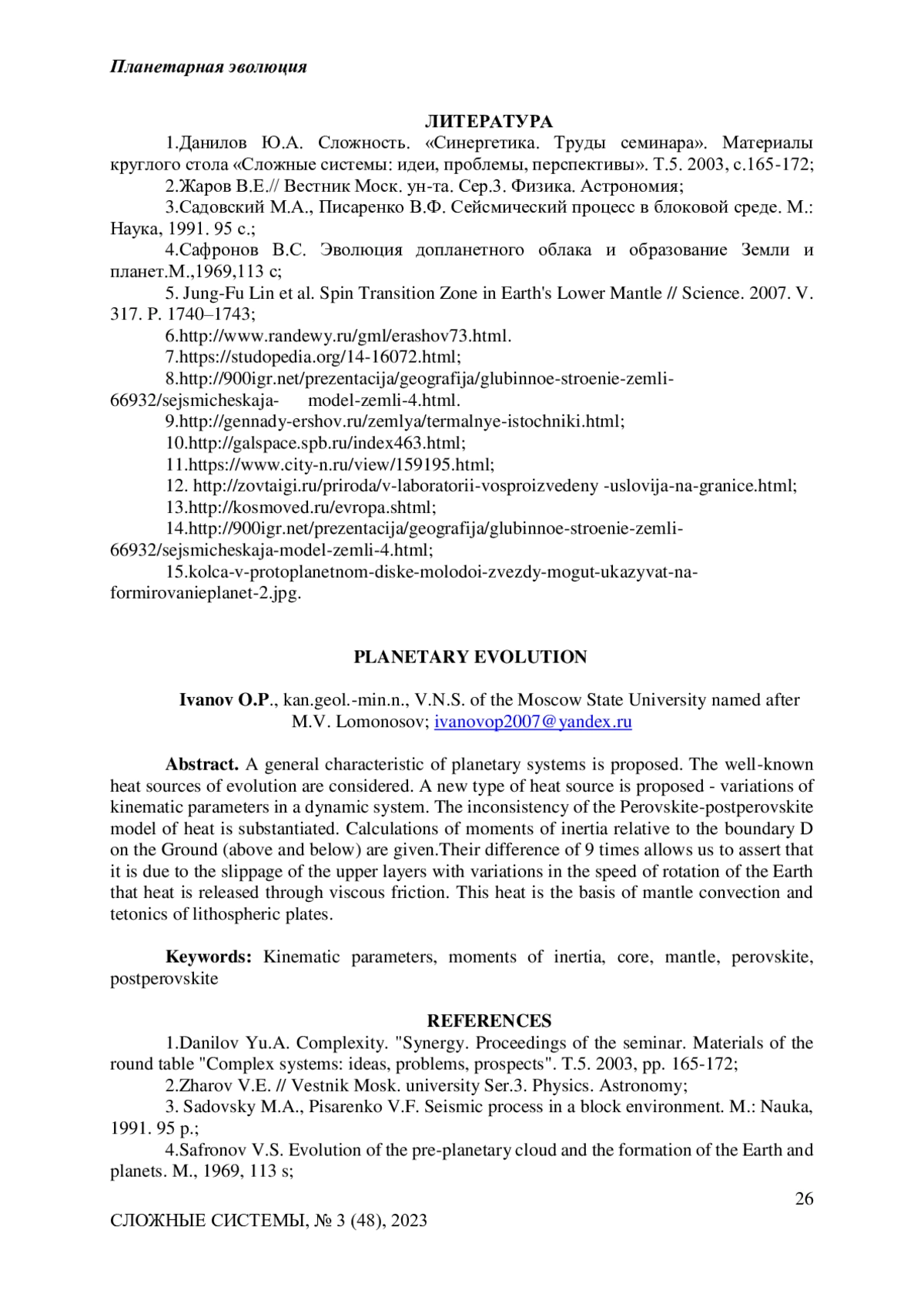 Предложена общая характеристика планетарных систем. Рассмотрены общеизвестные теплые источники эволюции. Предложен новый тип источника тепла - вариации кинематических параметров в динамической системе. Обоснована несостоятельность перовскит-постперовскитовой модели тепла. Приведены расчеты моментов инерции относительно границы D на Земле (выше и ниже). Различие их в 9 раз позволяет утверждать, что именно за счет проскальзывания верхних слоев при вариациях скорости вращения Земли происходит выделение тепла через вязкое трение. Это тепло является основой конвекции мантии и тетоники литосферных плит.