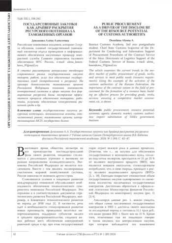 - Доньшина А.А. Роль закупок в развитии системы обеспечения деятельности таможенных органов // В сборнике: Актуальные проблемы таможенного администрирования. Материалы Молодежной научной конференции. Редколлегия: Ю.В. Малевич [и др.]. Санкт-Петербург, 2023. С. 58-63. EDN: ZLVDLW