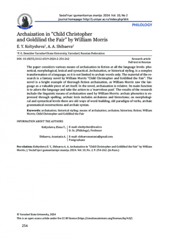 В статье исследуются средства архаизации художественного текста на фонетическом, морфологическом, лексическом и грамматическом (синтаксическом) уровнях языка. Архаизация, или историческая стилизация, как комплексное преобразование языка, не ограничивается уровнем лексики - архаизмами. В качестве материала исследования выбран фэнтези - роман Уильяма Морриса «Child Christopher and Goldilind the Fair» как пример кропотливой архаизации художественного текста. Авторы статьи приходят к выводу о том, что в романе У. Морриса язык - это, скорее, самоценный объект творчества, нежели средство создания сеттинга. Архаизация в «Child Christopher and Goldilind the Fair» весьма условна, поскольку роман в жанре фэнтези не имеет цели воссоздать какой - либо исторический период, а архаизация несет главным образом эстетическую функцию и переносит действие романа в «прекрасное абстрактное прошлое». В результате исследования выделены разнообразные средства архаизации художественного текста на английском языке. Фонетические особенности передаются с помощью архаичной орфографии; на морфологическом уровне применяются устаревшие принципы словообразования; архаизация на лексическом уровне представлена архаизмами (в том числе семантическими) и историзмами; на уровне грамматики это устаревшая глагольная парадигма, архаичные грамматические конструкции и особый синтаксис.