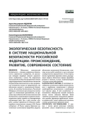 РЕЗУЛЬТАТЫ ИССЛЕДОВАНИЯ. В статье, с точки зрения различных подходов, произведен анализ теоретических концепций экологической безопасности. Рассматривается процесс формирования, становления и развития концепции экологической безопасности в Российской Федерации, обозначены нововведения и выявлены проблемы, существующие в нашей стране в отношении обеспечения экологической безопасности и реализации норм экологического законодательства в области обеспечения защиты и сохранения окружающей среды и всех ее компонентов.