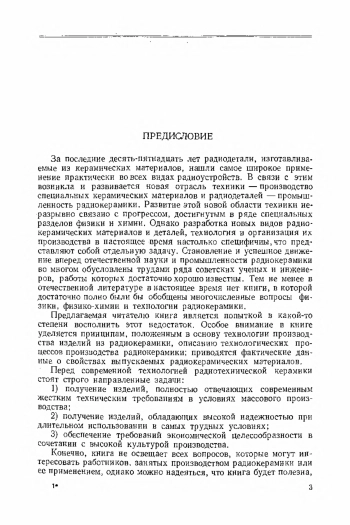 В книге излагается сущность электрических, физико-химических и механических процессов, положенных в основу производства радиокерамических деталей. Рассматриваются сырьевые материалы для получения керамики, методы приготовления керамических масс, способы оформления заготовок, сушка, обжиг керамических деталей, методы шлифования и нанесения металлических слоев. Дается классификация и приводятся характеристики всех основных радиокерамических материалов, а также сведения об оборудовании радиокерамического производства, методах автоматизации процесса обжига и возможностях дальнейшего улучшения радиокерамики. Книга предназначена для технологов радиокерамического производства и может быть полезна в качестве учебного пособия для студентов технических вузов, специализирующихся по материалам и радиодеталям.