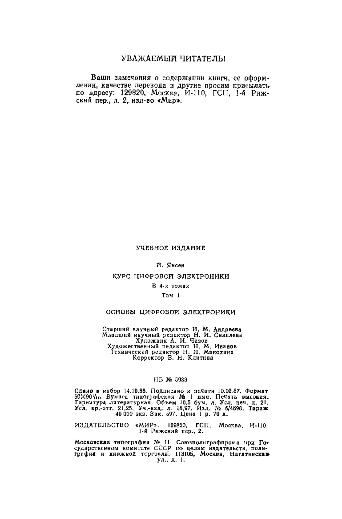 В отечественной литературе отсутствуют книги, где в доступной форме излагались бы принципы построения цифровых электронных элементов и рекомендации по их разработке и применению. Данный курс по цифровой электронике заполняет этот пробел. Он создан крупным голландским специалистом в области микросхемотехники. В томе 1 изложены основы цифровой техники, описана элементная база цифровых интегральных микросхем и даны практические рекомендации по монтажу и наладке цифровых систем. Для инженеров и специалистов в области электроники и вычислительной техники, а также для аспирантов и студентов соответствующих специальностей.