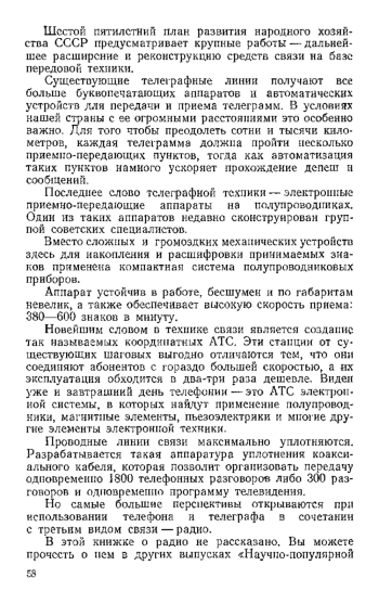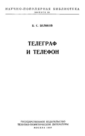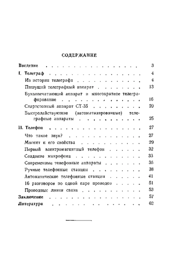 В наше время исключительное значение приобрели средства электрической связи: телеграф, телефон и радио. Связь необходима везде и всюду. По телеграфу, телефону и по радио передаются указания и распоряжения органов государственной власти. Средствами связи широко пользуются многочисленные учреждения, предприятия, совхозы, колхозы и все граждане нашей великой страны. Не будь электрической связи в нашей стране и за рубежом, мы узнавали бы о событиях с очень большим опозданием. В этой книжке кратко рассказывается, как возникли и совершенствовались электрические средства связи, как устроена и работает современная аппаратура проводной связи, каковы ближайшие перспективы развития электросвязи в нашей стране.