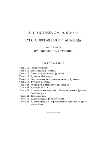 Книга разделена на две части. Первая из них содержит изложение основных вопросов комплексного анализа. Вторая часть посвящена главным образом изучению различных классов специальных функций. Хотя за тридцать лет, прошедшие с выхода первого русского издания, появилось много книг и работ по специальным функциям (например, справочник Эрдэя, Магнуса, Обереттингера и Трикони Higher transcendental functions, тт. I—III), книга Уиттекера и Ватсона остается непревзойденной по широте охвата и четкости комплексной («современной») точки зрения на специальные функции.