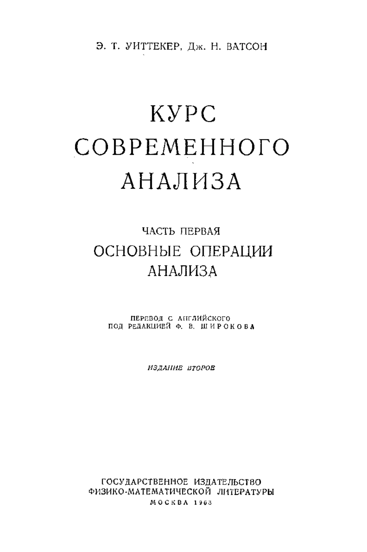 «Курс современного анализа» Уиттекера и Ватсона выдержал за рубежом несколько изданий. Начиная с четвертого издания (1927 г.) зарубежные издания стали стереотипными. Первое русское издание вышло в 1933—1934 гг. под редакцией Г. М. Голузина. Второе русское издание, предлагаемое сейчас читателю, еще раз сверено с английскими изданиями. В нем устранены замеченные опечатки, произведена незначительная модернизация терминологии и добавлены некоторые ссылки. В остальном оно сохранило стиль английской школы классического комплексного анализа (Бромвич, Барнс, Бэйли, Харди и Литлвуд, Титчмарш), с которой советский читатель знаком теперь по многочисленным переводам.