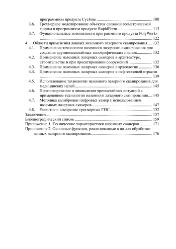 В книге рассмотрены устройство, принцип действия и классификация наземных лазерных сканеров. Приведены источники погрешностей в результате наземного лазерного сканирования и даны практические рекомендации по их исключению. Изложены методы и выполнен анализ внешнего ориентирования сканов. Разработана методика прокладки сканерных ходов. Большое внимание уделено технологии наземного лазерного сканирования и методикам создания топографических планов и построения цифровых моделей объектов и рельефа местности с использованием различных программ для обработки данных наземного лазерного сканирования.