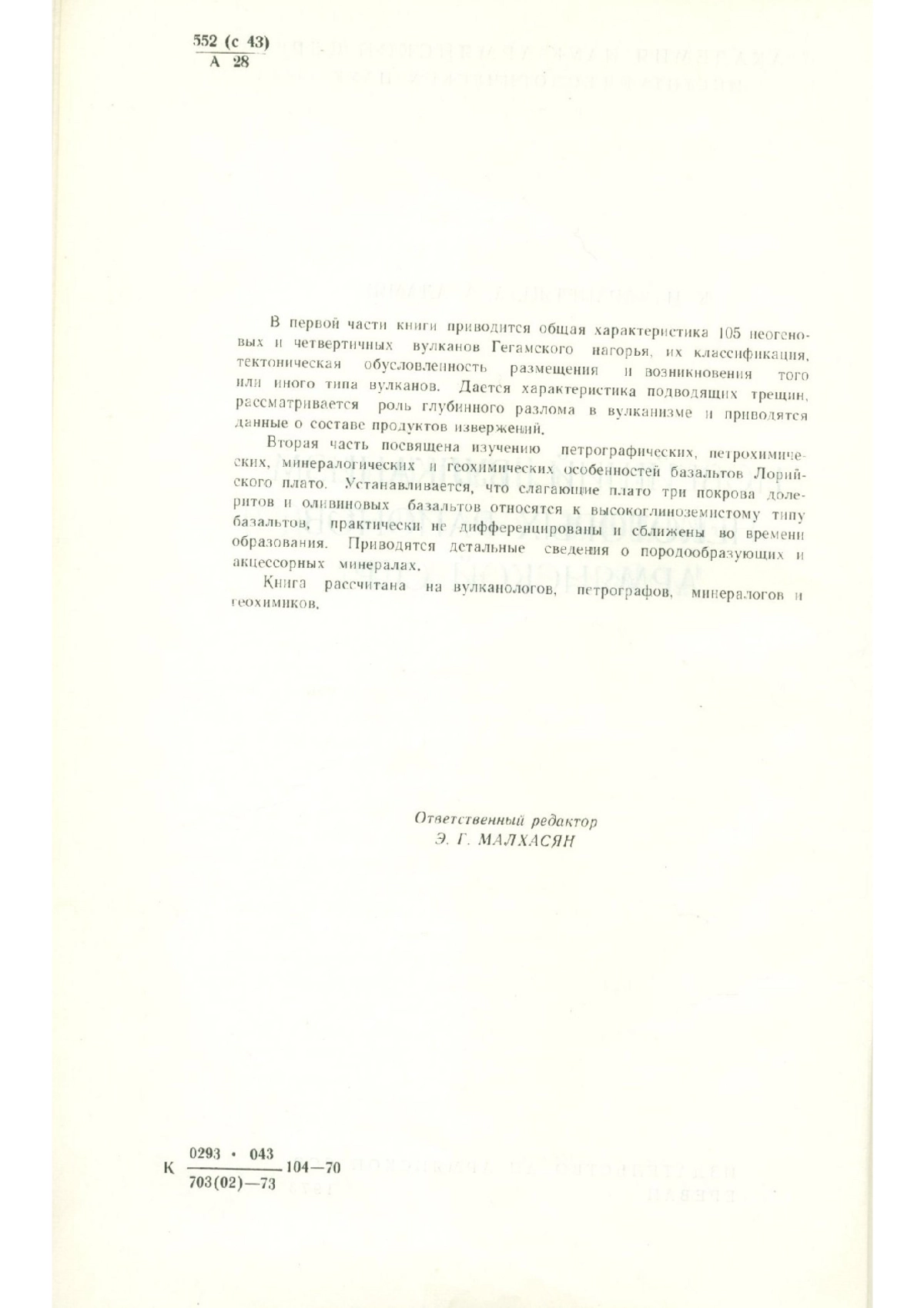 В первой части книги приводится общая характеристика 105 неогеновых и четвертичных вулканов Гегамского нагорья, их классификация тектоническая обусловленность размещения и возникновения того или иного типа вулканов. Дается характеристика подводящих трещин рассматривается роль глубинного разлома в вулканизме и приводятся данные о составе продуктов извержений.