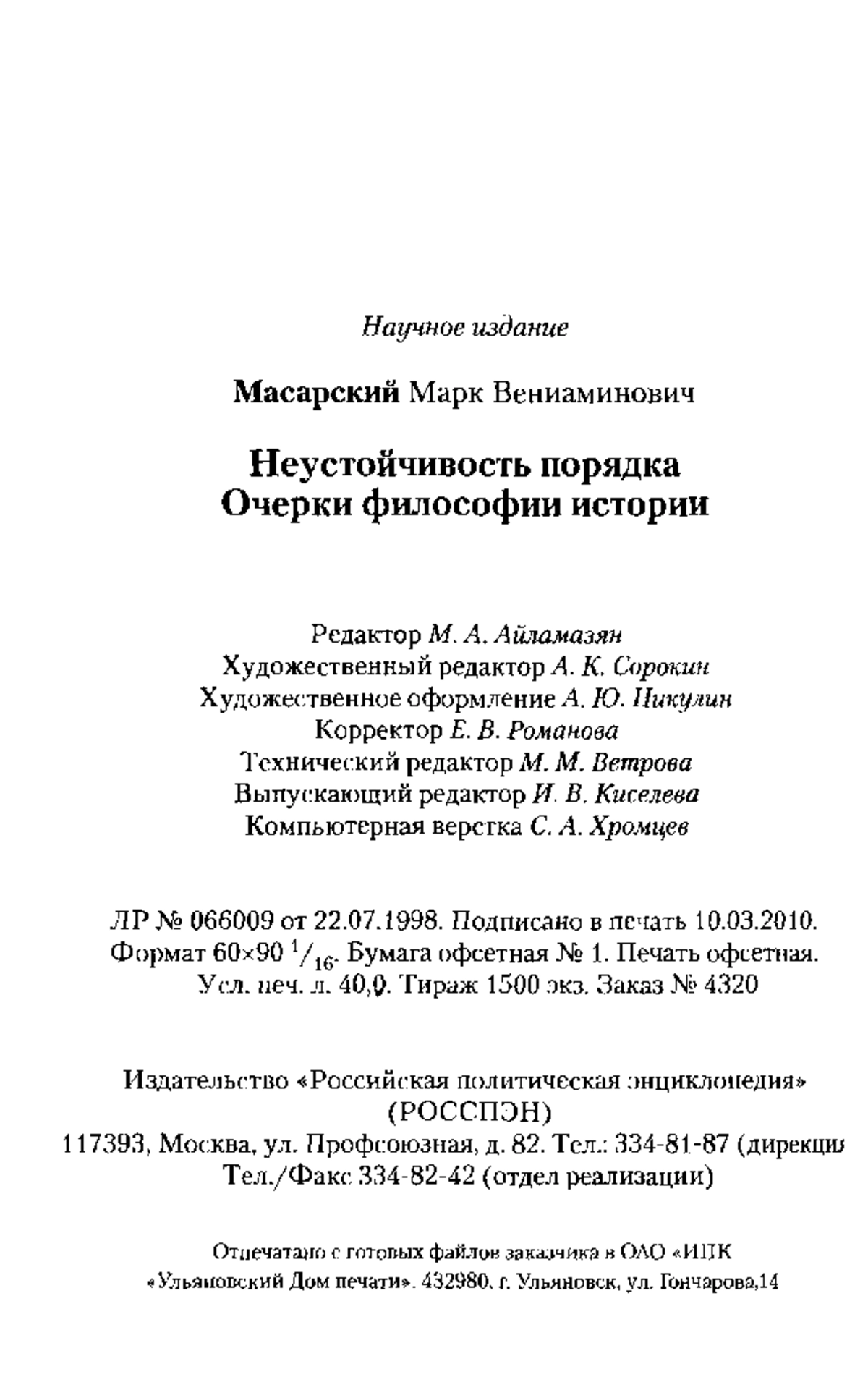 Область научных интересов философа Марка Масарского — исследование системной динамики ключевых событий мировой и российской истории. В том числе — критических «точек исторического невозврата». Книга «Неустойчивость порядка» сопоставляет их с позиций синергетического историзма.
