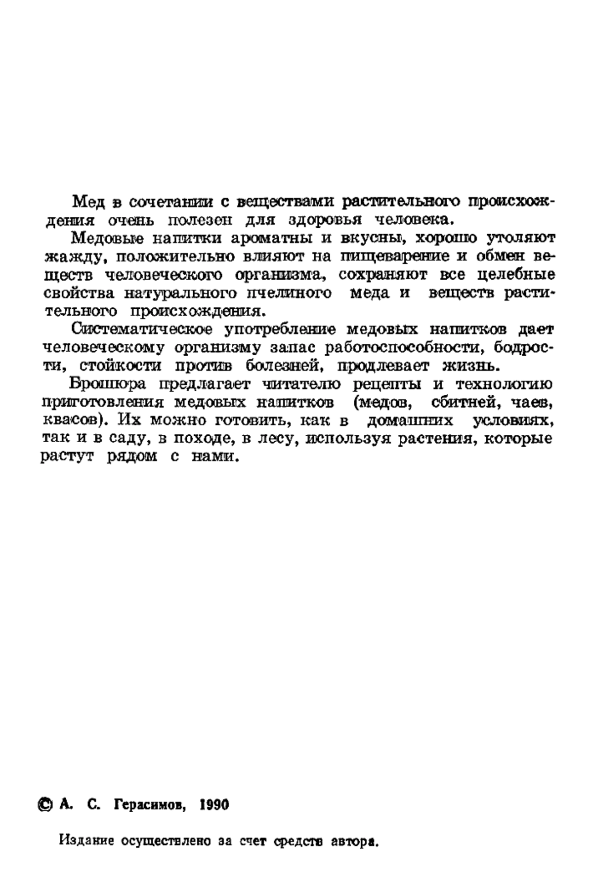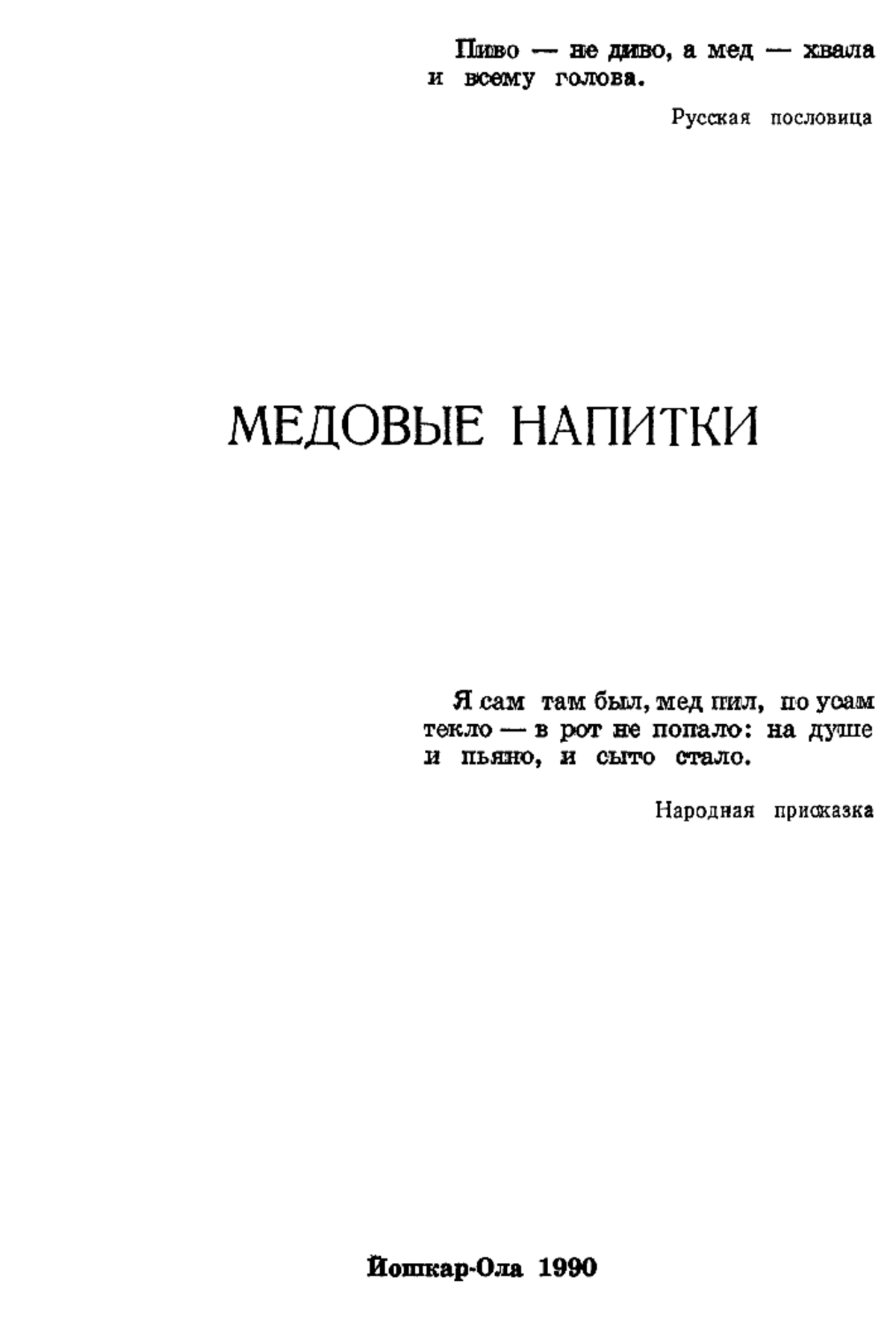 Мед в сочетании с веществами растительного происхождения очень полезен для здоровья человека. Медовые напитки ароматны и вкусны, хорошо утоляют жажду, положительно влияют на пищеварение и обмен веществ человеческого организма, сохраняют все целебные свойства натурального пчелиного меда и веществ растительного происхождения. Систематическое употребление медовых напитков дает человеческому организму запас работоспособности, бодрости, стойкости против болезней, продлевает жизнь. Брошюра предлагает читателю рецепты и технологию приготовления медовых напитков (медов, сбитней, чаев, квасов). Их можно готовить, как в домашних условиях, так и в саду, в походе, в лесу, используя растения, которые растут рядом с нами.