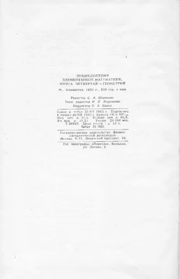 Первые три книги «Энциклопедии элементарной математики» (сокращенно ЭЭМ), посвящённые арифметике, алгебре и анализу, вышли свыше десяти лет тому назад. Теперь после долгого перерыва редакция решила завершить этот труд. За эти годы коллектив сотрудников ЭЭМ понёс большие потери.