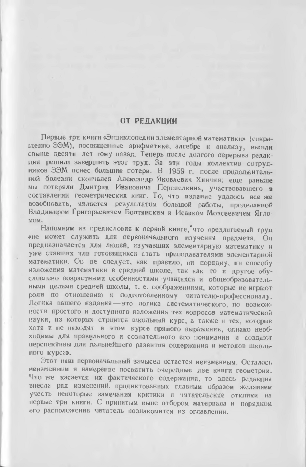 В 1959 г. после продолжительной болезни скончался Александр Яковлевич Хинчин; ещё раньше мы потеряли Дмитрия Ивановича Перепёлкина, участвовавшего в составлении геометрических книг. То, что издание удалось всё же возобновить, является результатом большой работы, проделанной Владимиром Григорьевичем Болотянским и Исааком Моисеевичем Яглом.