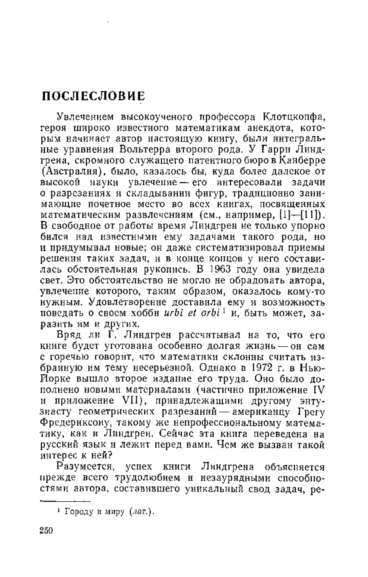 Книга Гарри Линдгрена продолжает серию книг по занимательной математике, начатую издательством в 1971 г. книгами М. Гарднера, и посвящена одному из увлекательнейших ее разделов — задачам на разрезание.
