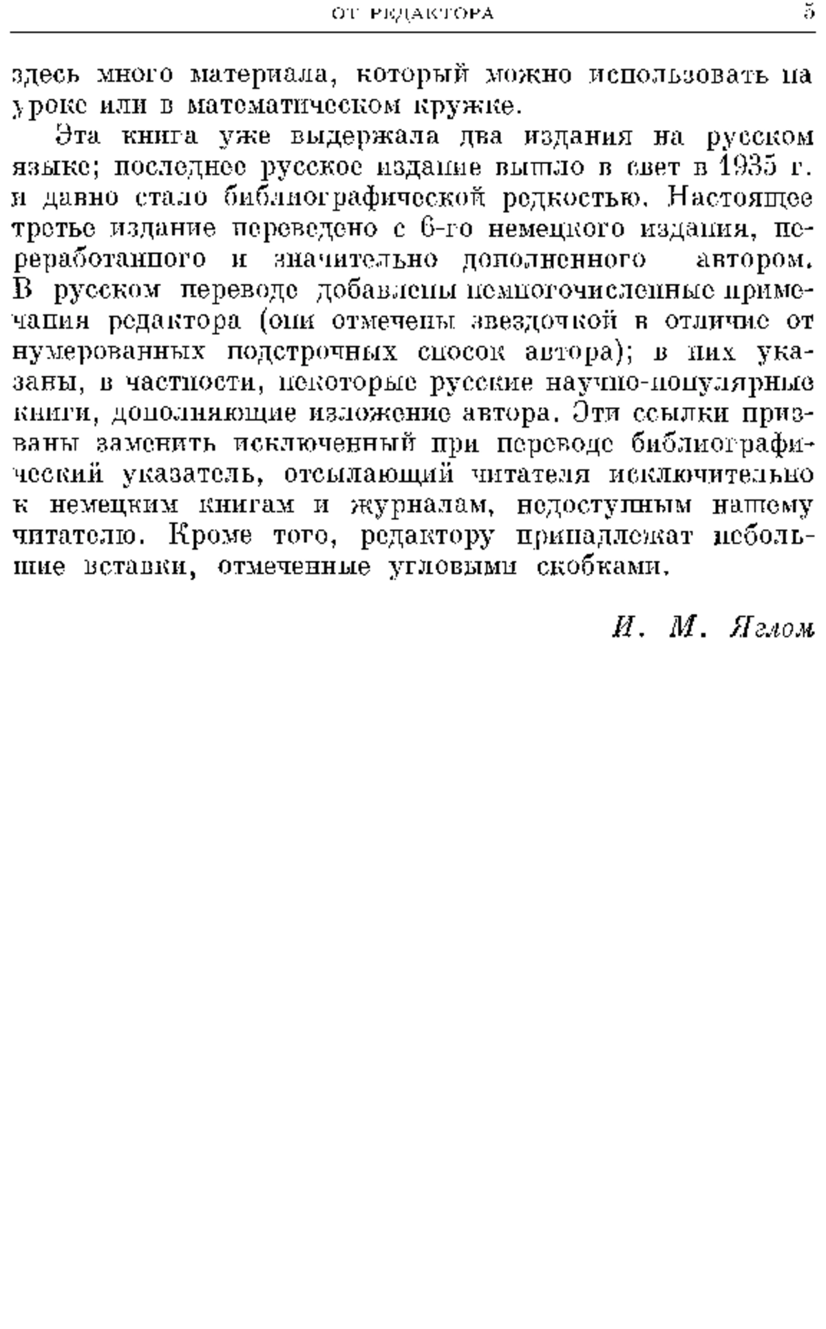 Эта небольшая книжка, написанная известным немецким популяризатором математики, недавно скончавшимся профессором Геттингенского университета Вальтером Литцманом, посвящена не только геометрии, как можно было бы подумать по ее названию. Автор собрал в ней довольно разнообразный материал, относящийся и к геометрии, и к алгебре, и к арифметике.