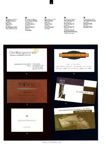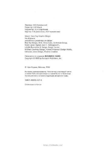 Визитные карточки - свидетельство достоинства их обладателей, вкуса, респектабельности. Они служат моментальным снимком, вызывающим в памяти воспоминание о деловой встрече спустя некоторое время после нее. В данное издание включены лучшие образцы карточек — фавориты из числа тех, которые довелось оценивать американскому издательству «Рокпорт паблишерс» на многочисленных конкурсах дизайна. Представлены лучшие дизайнеры из многих стран, демонстрирующие читателям свое умение с помощью визитных карт прокладывать себе путь к более широкому деловому общению.