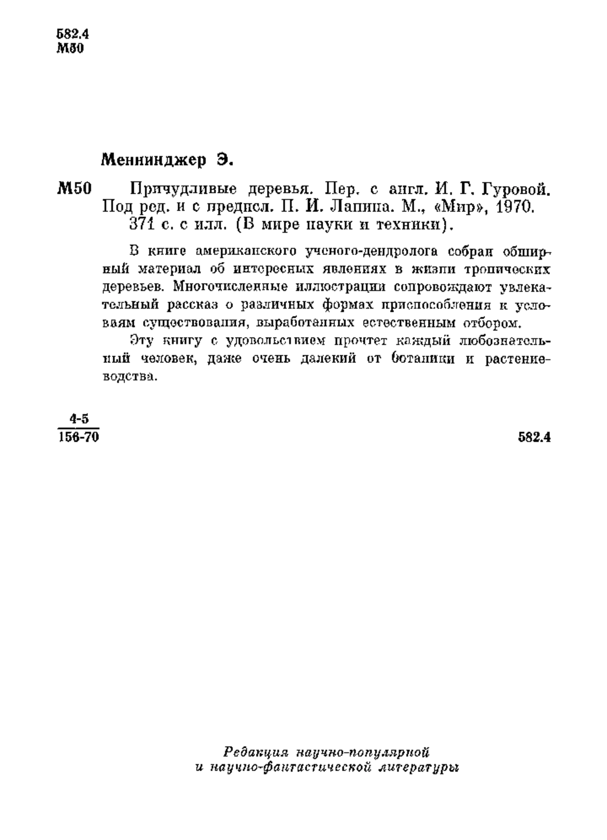 Перед вами очередное издание из серии «В мире науки и техники». В книге американского ученого-дендролога собран обширный материал об интересных явлениях в жизни тропических деревьев. Многочисленные иллюстрации сопровождают увлекательный рассказ о различных формах приспособления к условиям существования, выработанных естественным отбором. Эту книгу с удовольствием прочтет каждый любознательный человек, даже очень далекий от ботаники и растениеводства.