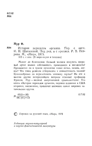 История пересадок органов. Пер. с англ. И. Н. Шаталовой. Под ред. и с предисл. Р. В. Петрова. М., «Мир», 1973. 312 с. с илл. (В мире науки и техпики)