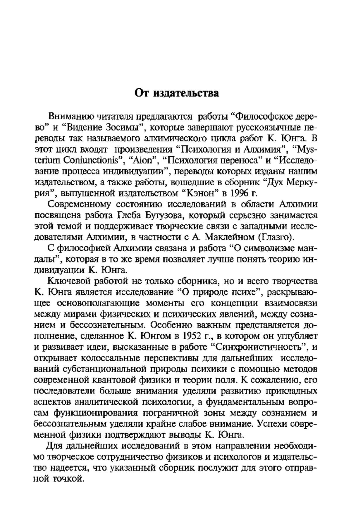 Вниманию читателя предлагаются работы «Философское дерево» и «Видение Эссимы», которые завершают русскоязычные переводы так называемого алхимического цикла работ К. Юнга. В этот цикл входят произведения «Психология и Алхимия», «Mysterium Coniunctionis», «Aion», «Психология переноса» и «Исследование процесса индивидуации», переводы которых изданы нашим издательством, а также работы, вошедшие в сборник «Дух Меркурия», выпущенный издательством «Кэнон» в 1996 г.