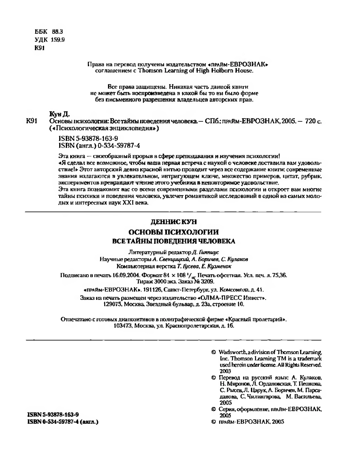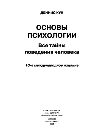 Кун Д. Основы психологии: Все тайны поведения человека. — СПб.: прайм-ЕВРОЗНАК, 2005. — 720 с.