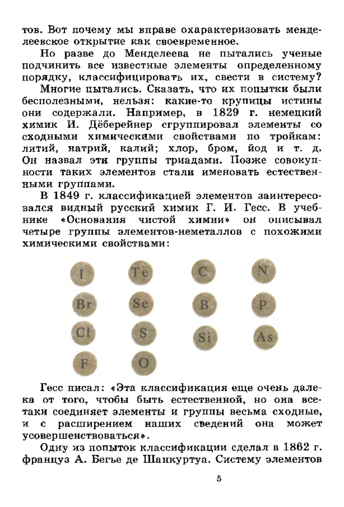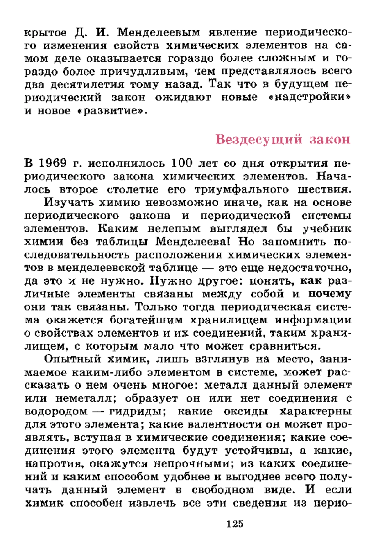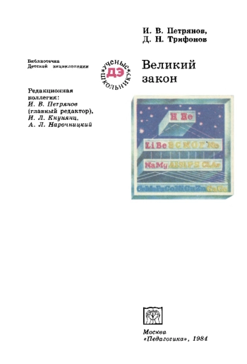 В истории человеческих знаний немало подвигов. Но очень немногие из них можно сопоставить с тем, что было сделано Дмитрием Ивановичем Менделеевым. Величие научного подвига Менделеева не только не стирается временем, но продолжает расти. И никто не может сказать, будет ли когда-нибудь исчерпано до конца все содержание одного из величайших в науке обобщений — периодического закона Менделеева. Периодический закон, открытый Д. И. Менделеевым, отмечен в истории науки как начало новой эры в развитии одной из ведущих современных наук — химии. В книге рассказывается: как был открыт периодический закон, как была найдена разгадка периодичности, излагается суть периодического закона на современном уровне знаний. Настоящее издание посвящено 150-летию со дня рождения Д. И. Менделеева. Для старшеклассников.
