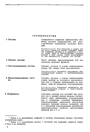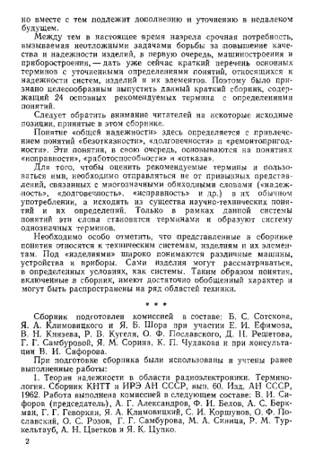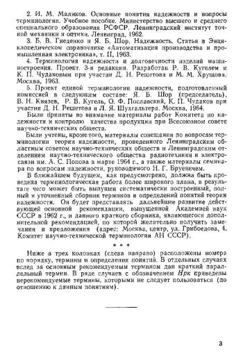Развитие современной техники характеризуется все возрастающим значением задачи обеспечения надежности технических систем, изделий и их элементов. Этим определяется актуальная необходимость выработки правильной терминологии, связанной с вопросами надежности. Уточнение и определение понятий, выявление объективных связей между ними, правильный выбор терминов, выражающих понятая и удовлетворяющих необходимым требованиям (однозначности, точности, систематичности, краткости и др.), — т. е. создание научно обоснованной терминологии, относящейся к надежности,— крайне важно для подготовки научных и инженерных кадров, для работы по расчету, конструированию, проектированию и эксплуатации машин, систем машин, устройств, приборов, аппаратов и т. п.