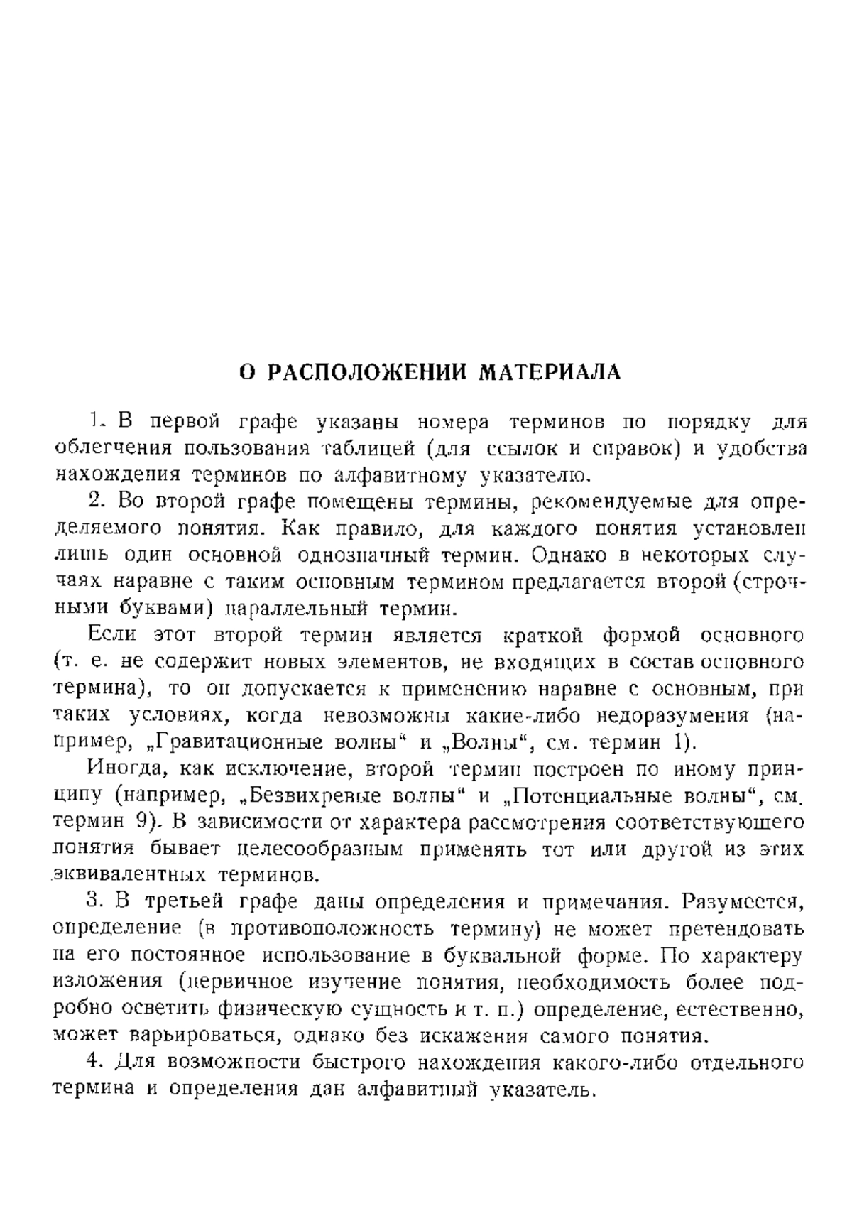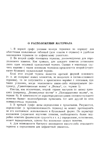 В сборнике дается терминология специальной главы гидромеханики, изучающей волновые движения жидкости. Термины, относящиеся к волновым движениям, происходящим в различных средах, иных, нежели жидкость, в данный сборник не входят. Сборник содержит: Термины 1—4, указывающие на силы, под влиянием которых возникают волны. Термины 5—9, дающие общую геометрическую и кинематическую характеристику волн. Термины 10—11, дающие указания на метод изучения волн. Термины 12—18, содержащие определения основных геометрических характеристик волновой поверхности. Термины 19—51, содержащие определения элементов волн, наиболее часто встречающихся и хорошо изученных.
