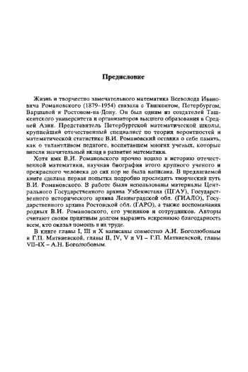 В книге по литературным и архивным материалам рассказано о жизни и деятельности замечательного математика В. И. Романовского - крупнейшего специалиста в области теории вероятностей и математической статистики. Кроме проведения основных исследований, он работал над практическим применением развиваемых им теорий. В. И. Романовский был одним из создателей Ташкентского университета и организаторов высшего образования в Средней Азии. Книга для читателей, интересующихся историей отечественной науки и техники.