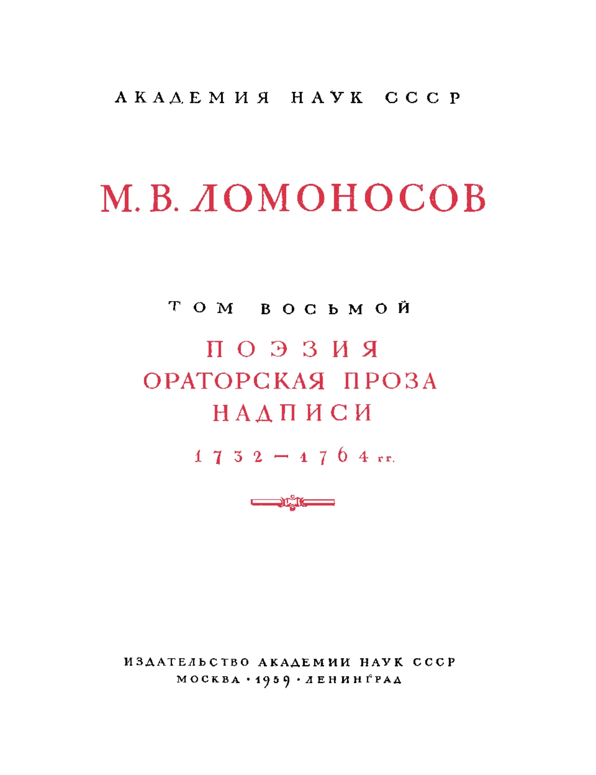 Восьмой том «Полного собрания сочинений» М. В. Ломоносова содержит его поэтические произведения, оригинальные и переводные, ораторскую прозу, за исключением вошедших в предыдущие томы научных речей, а также все те стихотворные и прозаические сочинения, которые он объединял общим названием «надписи», т. е. стихи для иллюминационных транспарантов и составляющие с ними неразрывное целое прозаические проекты иллюминаций, стихи для придворных маскарадов, надписи к памятникам и статуям, надписи для мемориальных досок и эпитафии. Поэзия Ломоносова, как только она стала известна в России, была встречена восторженно и очень скоро создала ему громкую славу, которая как при жизни его, так и на протяжении многих десятилетий после его смерти превосходила его ученую славу.