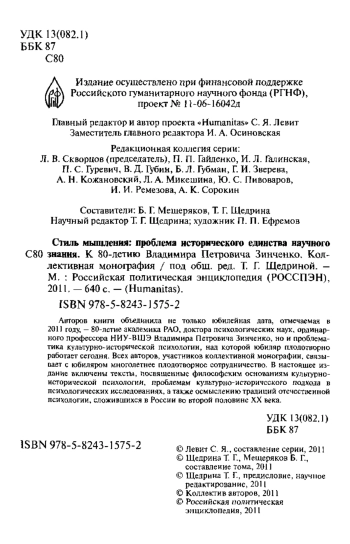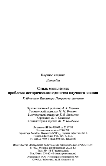 Стиль мышления: проблема исторического единства научного знания. К 80-летию Владимира Петровича Зинченко. Коллективная монография / под общ. ред. Т. Г. Щедриной. – М.: Российская политическая энциклопедия (РОССПЭН), 2011. – 640 с. – (Humanitas).