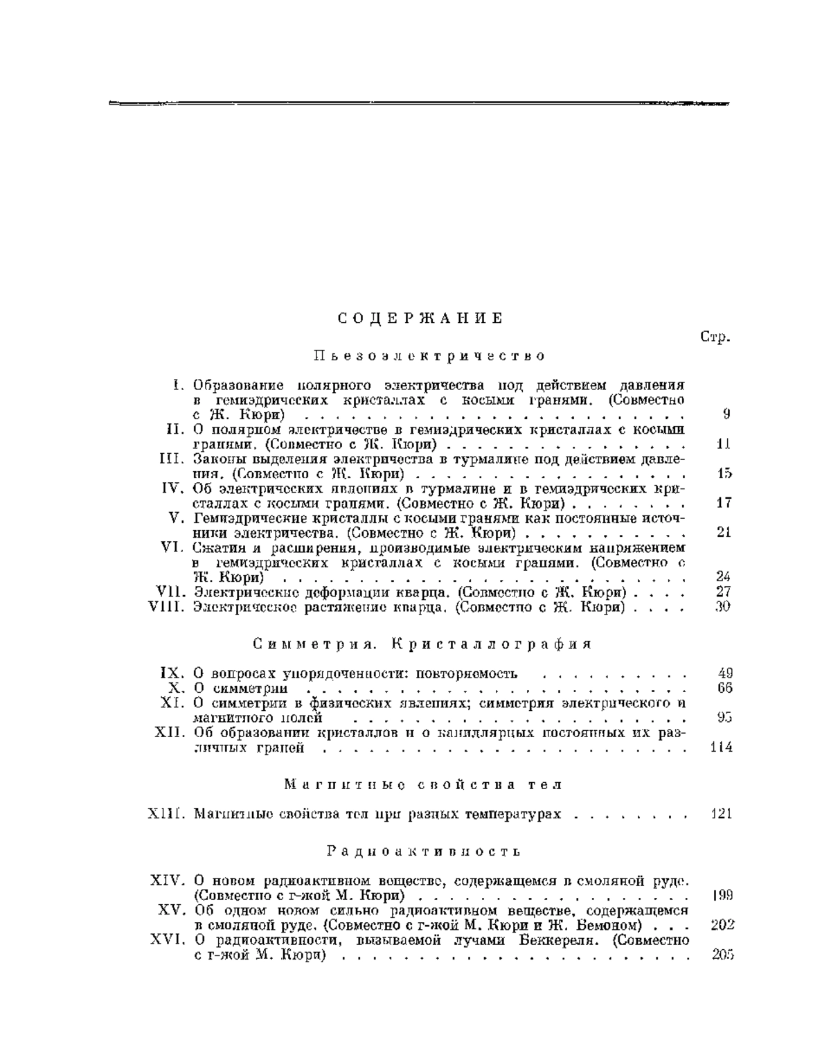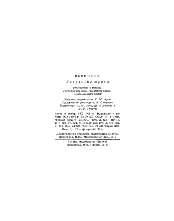 Творческая жизнь Пьера Кюри была непродолжительна — всего 26 лет. Трагический несчастный случай оборвал ее, когда ему было только 47 лет. По своему объему его научное наследие невелико. Однако за 26 лет он успел сделать ряд выдающихся открытий, вызвавших переворот в основных представлениях физики, он успел провести ряд замечательных исследовании, оказавшихся в высшей степени плодотворными для последующего развития физики. Настоящее издание трудов П. Кюри содержит 39 его важнейших работ по физике и кристаллографии. Они сгруппированы в четыре раздела: 1) работы по пьезоэлектричеству; 2) работы по симметрии и кристаллографии; 3) работа по исследованию магнитных свойств тел и 4) работы и статьи по радиоактивности. В разделе «Приложения» помещен перевод извлечения из диссертации Жака Кюри, описывающего разработанный обоими братьями Кюри «пьезоэлектрический кварц» — прибор, который играл важную роль в работах Марии и Пьера Кюри по радиоактивности и часто упоминается в их статьях.