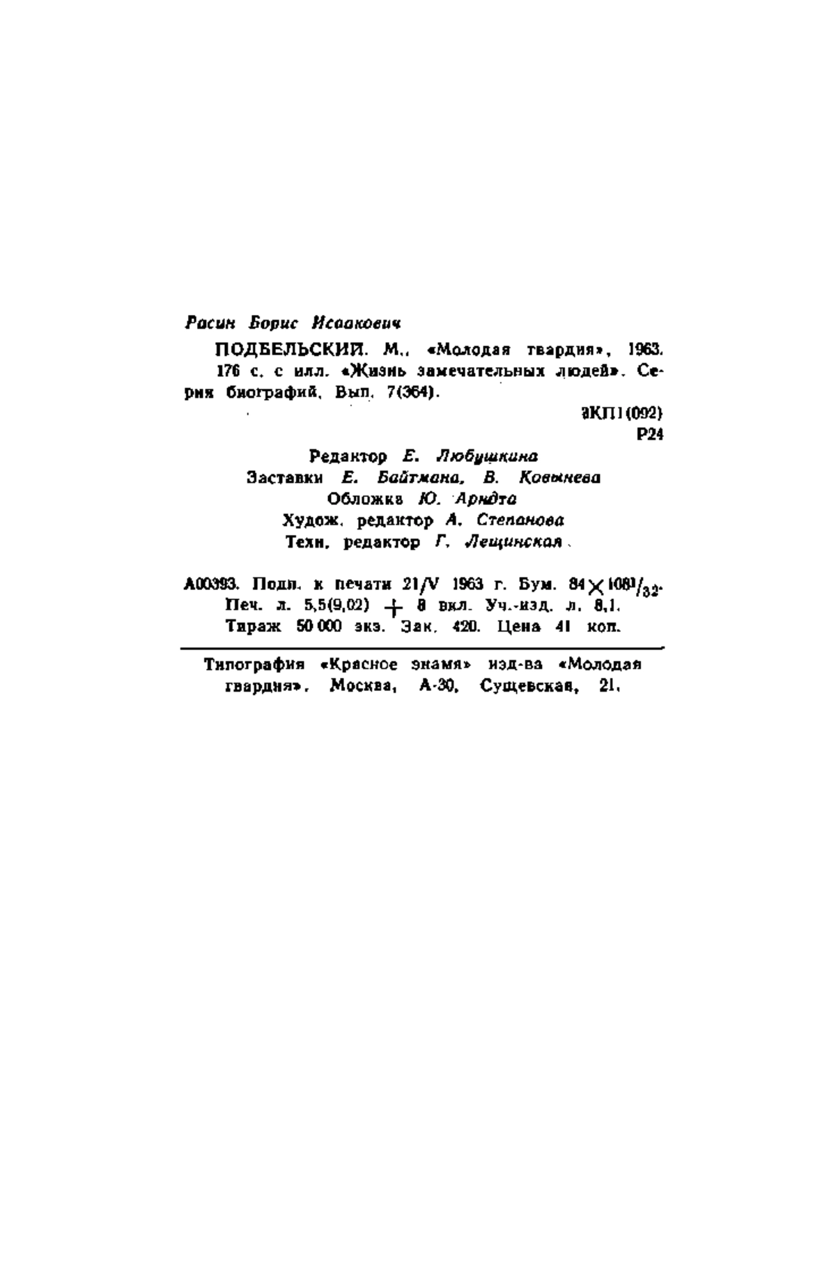 ПОДБЕЛЬСКИЙ. М., «Молодая гвардия», 1963. 176 с. с илл. «Жизнь замечательных людей». Серия биографий. Вып. 7(364).