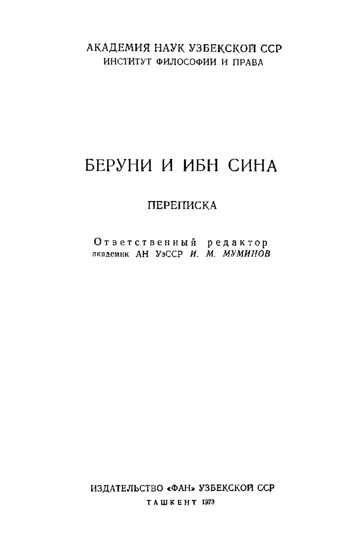 Во имя Аллаха милостивого, милосердного! Сказал Шейхраис: сие есть послание (Шейха Абу Али Хусейна, сына Абдаллаха) к Абу Райхану Мухаммаду, сыну Ахмада, Беруни в ответ на вопросы, которые он мне направил из Хорезма.