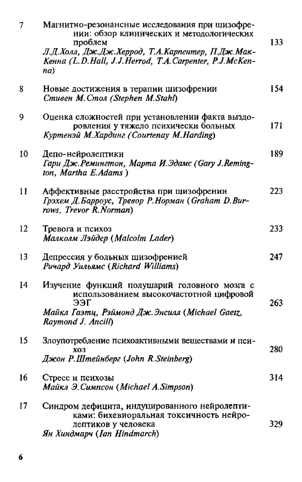 Приводятся исторический обзор развития концепции шизофрении в США с 1955, клинические и эпидемиологические данные о длительном катамнезе тяжелых форм заболевания, о современных методах реабилитации больных, новейших методах лечения, механизмах действия и побочных эффектах нейролептиков. Обсуждается ряд важных аспектов теории шизофрении, таких как патологические изменения головного мозга, ЭЭГ-показатели позитивных и негативных расстройств, особенности взаимоотношений и взаимообусловленности аффективных расстройств, депрессии, тревоги и шизофрении. Исследования шизофрении представлены параллельно с изучением психозов другого генеза: послестресса, при злоупотреблении лекарственными препаратами, при умственной отсталости и личностных нарушениях.
