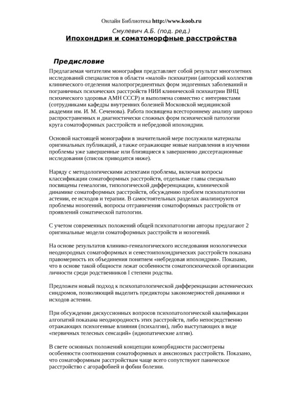 Коллективная монография посвящена всестороннему анализу широко распространенных и диагностически сложных форм психической патологии круга соматоформных расстройств и небредовой ипохондрии.