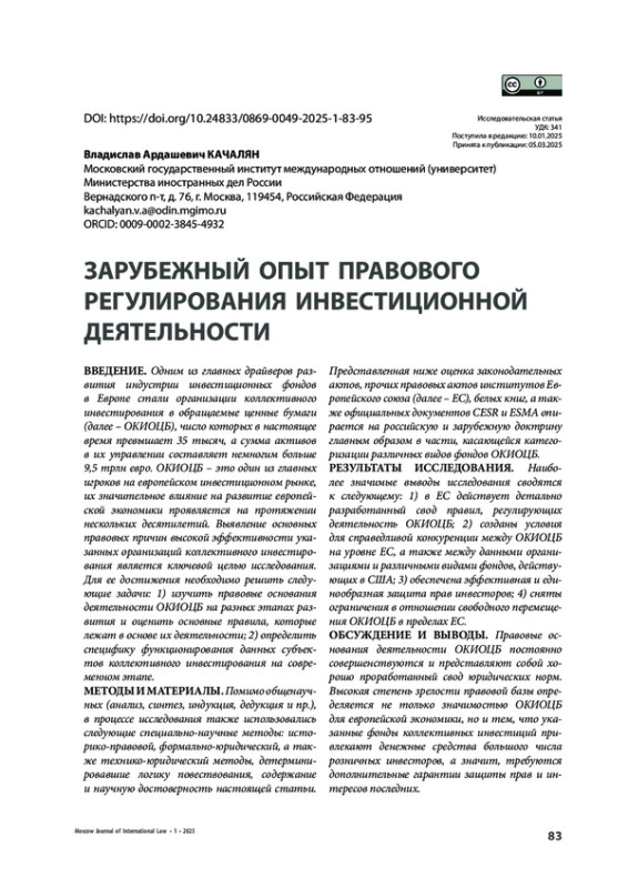 Kachalyan V.A. Foreign Experience in the Legal Governance of Investment Activities. Moscow Journal of International Law. 2025;(1):83-95. https://doi.org/10.24833/0869-0049-2025-1-83-95.