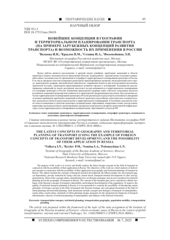 Целью работы является рассмотрение и краткий анализ новейших зарубежных концепций в области транспорта в связи с возможностью их применения в России. Задачи работы - краткий анализ отдельных концепций в связи с возможностью их применения в географии и территориального планирования транспорта в России. К их числу авторами отнесены концепции транспортно-ориентированного развития, пятнадцатиминутного города, транспортного разрыва, автомобильной зависимости, сокращения бедности при использовании велосипеда, транзитной пустыни, транспортно-ориентированного развития городов и агломераций. Большинство рассматриваемых концепций не имеют российских аналогов и не рассматриваются в территориальном планировании и в географии транспорта в России. Концепция транспортного разрыва может считаться отдаленным аналогом российских концепций транспортной уязвимости и транспортной дискриминации населения. Для улучшения качества территориального планирования транспорта в России рекомендуется рассмотреть возможность внедрения отдельных принципов зарубежных концепций в области транспорта в российские стратегические и концептуальные документы в области градостроительства и территориального планирования. К подобным документам можно отнести концепции и стратегии транспорта муниципальных образований, генеральные планы, мастер-планы, нормативы градостроительного проектирования, программы комплексного развития транспортной инфраструктуры, схемы территориального планирования муниципальных образований и субъектов РФ.