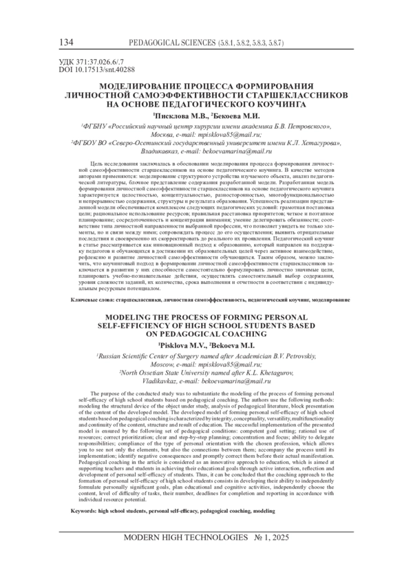 Цель исследования заключалась в обосновании моделирования процесса формирования личностной самоэффективности старшеклассников на основе педагогического коучинга. В качестве методов авторами применяются: моделирование структурного устройства изучаемого объекта, анализ педагогической литературы, блочное представление содержания разработанной модели. Разработанная модель формирования личностной самоэффективности старшеклассников на основе педагогического коучинга характеризуется целостностью, концептуальностью, разносторонностью, многофункциональностью и непрерывностью содержания, структуры и результата образования. Успешность реализации представленной модели обеспечивается комплексом следующих педагогических условий: грамотная постановка цели; рациональное использование ресурсов; правильная расстановка приоритетов; четкое и поэтапное планирование; сосредоточенность и концентрация внимания; умение делегировать обязанности; соответствие типа личностной направленности выбранной профессии, что позволяет увидеть не только элементы, но и связи между ними; сопровождать процесс до его осуществления; выявить отрицательные последствия и своевременно их скорректировать до реального их проявления. Педагогический коучинг в статье рассматривается как инновационный подход к образованию, который направлен на поддержку педагогов и обучающихся в достижении их образовательных целей через активное взаимодействие, рефлексию и развитие личностной самоэффективности обучающихся. Таким образом, можно заключить, что коучинговый подход в формировании личностной самоэффективности старшеклассников заключается в развитии у них способности самостоятельно формулировать личностно значимые цели, планировать учебно-познавательные действия, осуществлять самостоятельный выбор содержания, уровня сложности заданий, их количества, срока выполнения и отчетности в соответствии с индивидуальным ресурсным потенциалом.