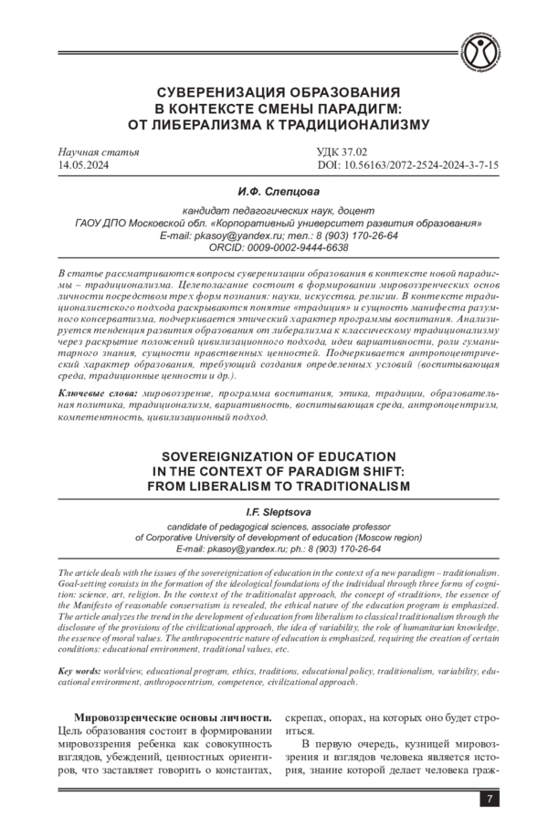 Статья: СУВЕРЕНИЗАЦИЯ ОБРАЗОВАНИЯ В КОНТЕКСТЕ СМЕНЫ ПАРАДИГМ: ОТ ЛИБЕРАЛИЗМА К ТРАДИЦИОНАЛИЗМУ
