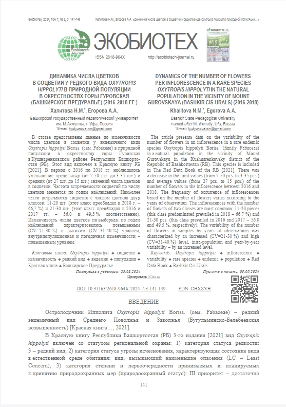 Статья: ДИНАМИКА ЧИСЛА ЦВЕТКОВ В СОЦВЕТИИ У РЕДКОГО ВИДА OXYTROPIS HIPPOLYTI В ПРИРОДНОЙ ПОПУЛЯЦИИ В ОКРЕСТНОСТЯХ ГОРЫ ГУРОВСКАЯ (БАШКИРСКОЕ ПРЕДУРАЛЬЕ) (2016-2018 ГГ.)