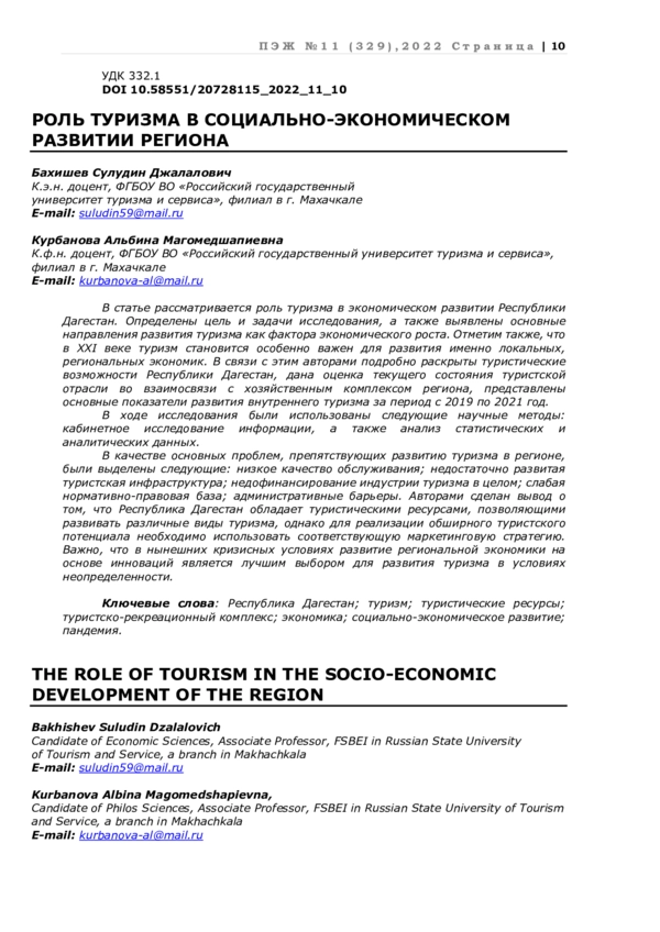 Статья: РОЛЬ ТУРИЗМА В СОЦИАЛЬНО-ЭКОНОМИЧЕСКОМ РАЗВИТИИ РЕГИОНА