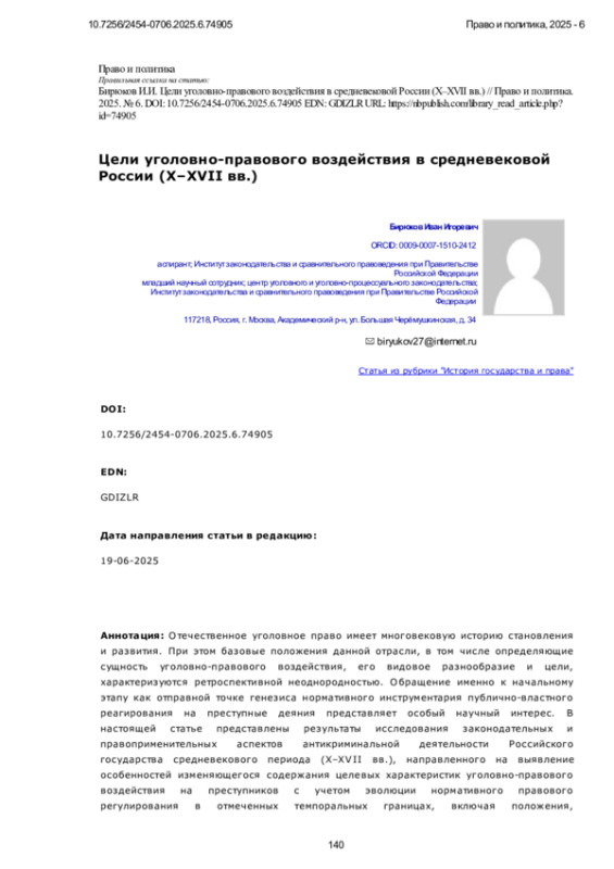 Статья: Цели уголовно-правового воздействия в средневековой России (X–XVII вв.)